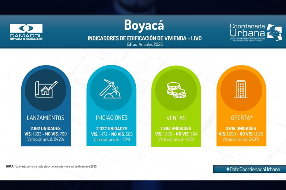 El mercado de vivienda nueva en el corredor Tunja–Paipa–Duitama–Sogamoso cerró 2025 en un contexto económico y normativo retador, de acuerdo con las cifras del sistema Coordenada Urbana, de acuerdo con las cifras del sistema Coordenada Urbana. Durante el año se comercializaron 1.894 unidades de vivienda, lo que representó una variación anual de -1,8% frente a 2024, evidenciando una contracción moderada del mercado.