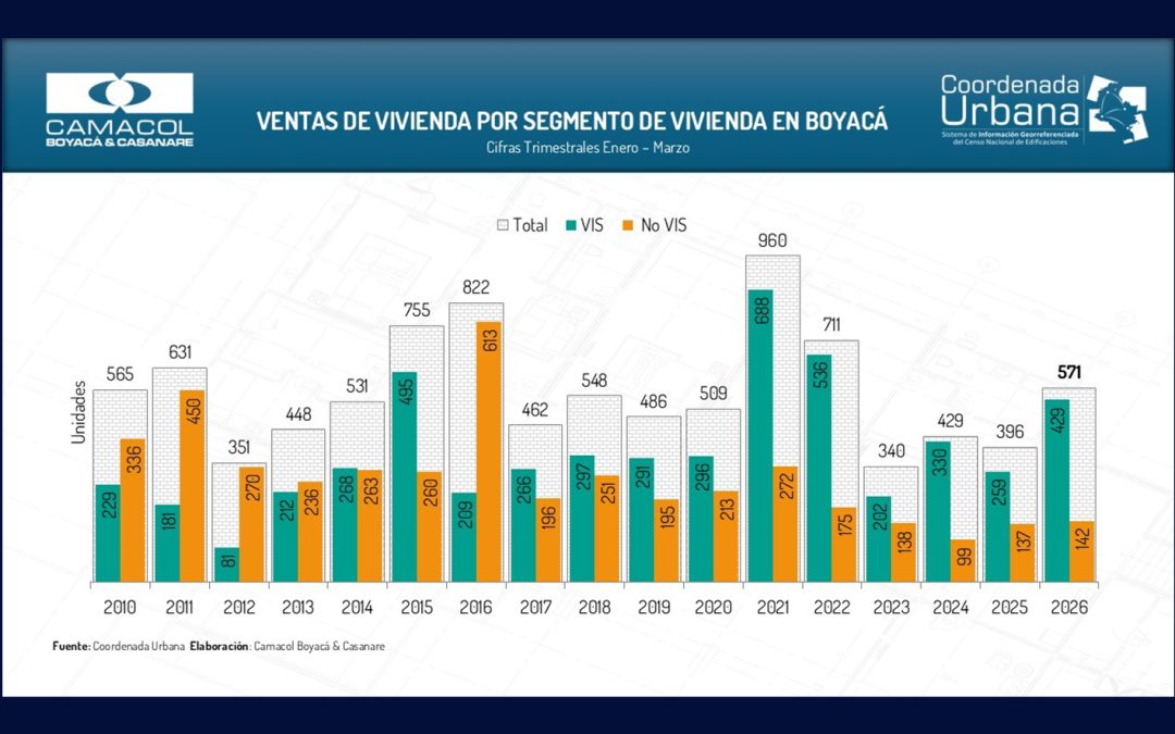 El mercado de vivienda nueva en el corredor Tunja–Paipa–Duitama–Sogamoso inició 2026 con un desempeño destacado. Entre enero y marzo se comercializaron 571 unidades, lo que refleja una recuperación significativa de la demanda frente al mismo periodo de 2025.